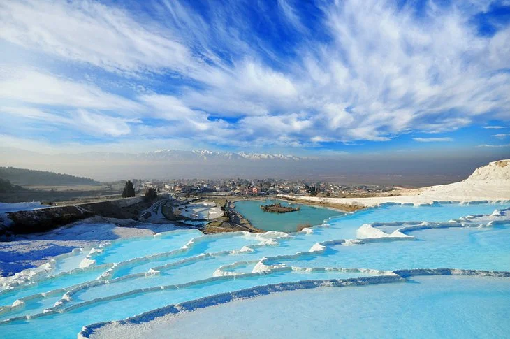 Pamukkale: Relax in the thermal pools of calcium terraces, known as the "Cotton Castle," and visit the ancient city of Hierapolis.